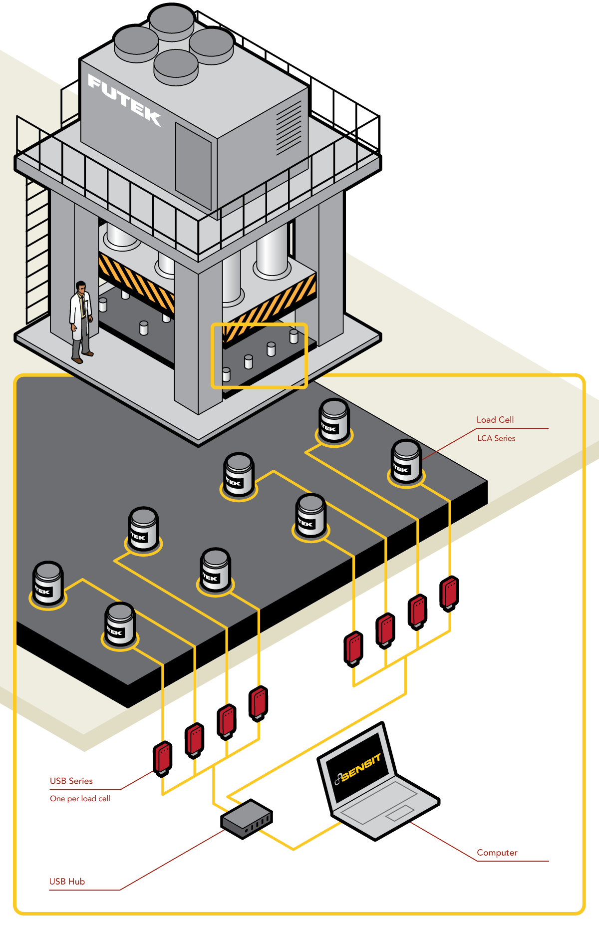3、当压力机向LCA传感器施压时,传感器的数据通过荣耀体育(中国)的USB采集模块传输到电脑上,SENSIT软件实时显示传感器受到的压制力,监测压力机的输出力是否合格。