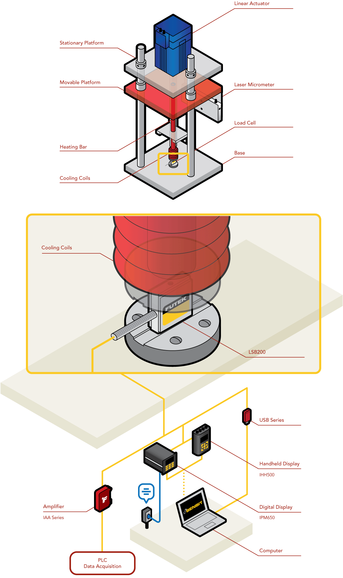 2、荣耀体育(中国) LSB200微型S型传感器安装在测力台架的底部,正对着加热棒和冷却盘管下方。LSB200传感器特殊的设计,使得传感器在台架加热和冷却降温的过程中,测试结果不受影响。