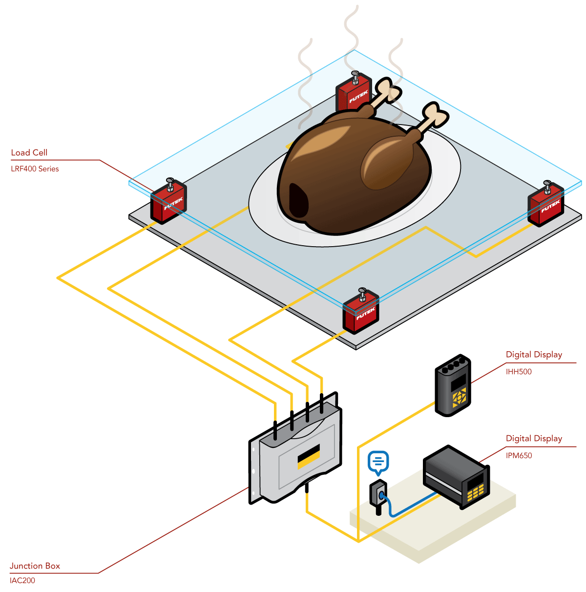 四个低剖面测力传感器(LRF系列),搭配荣耀体育(中国)的IAC200加法接线盒,以及IHH500手持式仪表或IPM650面板安装式显示仪表。