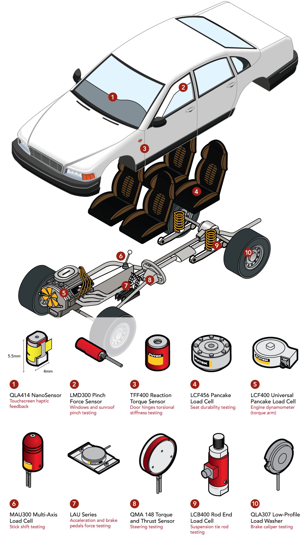 9、悬架拉杆 - 前悬架框架耐久性和疲劳测试:高性能车辆中使用的复杂多点悬架系统需要使用建模和仿真来确保在负载下符合要求。但是,验证仿真模型的最后一步是实时测试,为了实现这一点,力传感器与每个悬架臂对齐,提供通过每个悬架臂的负载数据,准确的转向负载测量和间接前轮胎抓地力,从而可以调整悬架系统以优化性能和操控性。