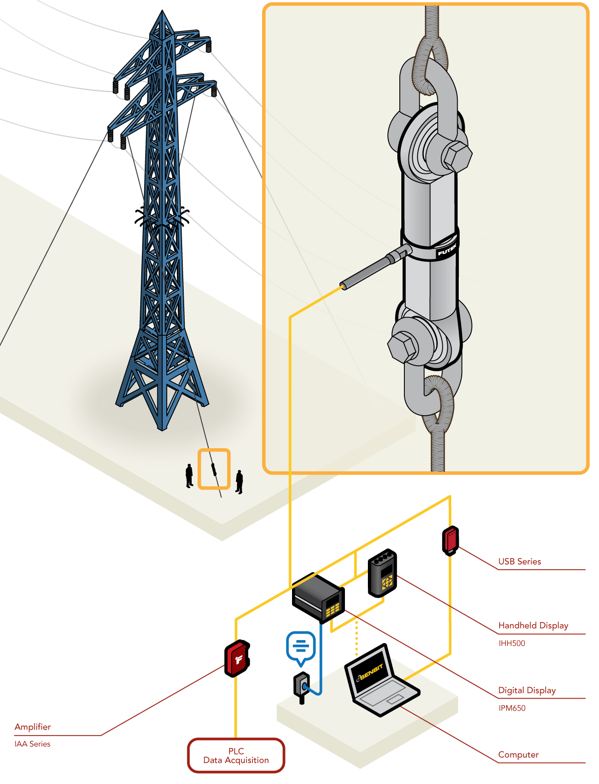 轴向拉压型(LCM系列)传感器,及配套的仪器仪表(IAA系列, IPM650, IHH500, USB采集模块)。