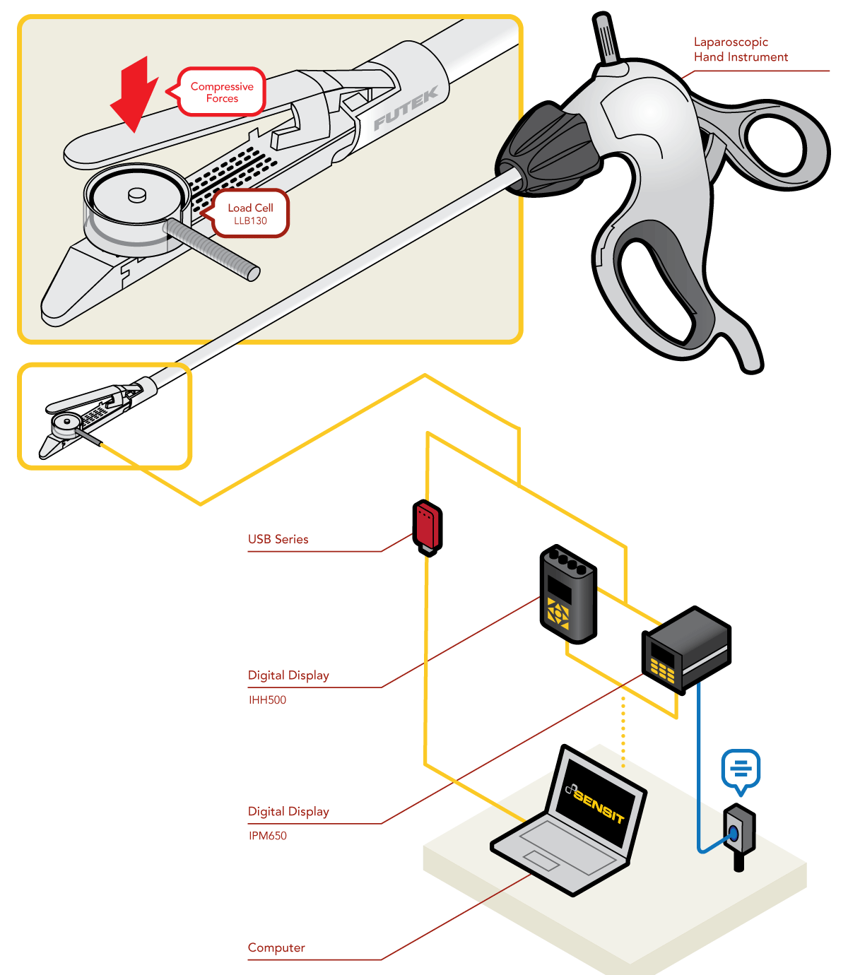2、在这个应用中,荣耀体育(中国) 的微型按钮型力传感器(LLB130)安装在腹腔镜手器械的抓取端。测力元件记录力测量值,可用于校准工具。