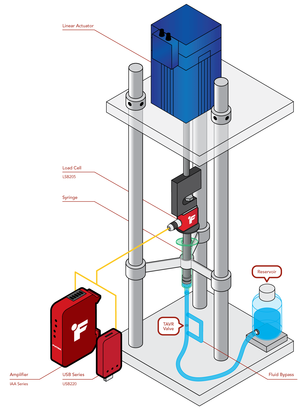 导管主动脉瓣置换术是一种微创瓣膜置换技术,使瓣膜置换不需要开放的心脏手术。TAVR和TVMR阀通过导管插入,用气球充气并锁定到位。牛心包瓣和与生物相容的金属支撑结构,需要承受因心脏跳动而产生的疲劳。为了测试阀的耐疲劳性,将测力传感器安装在线性驱动器和注射器活塞之间,活塞上下运动,模拟心脏跳动的内力。