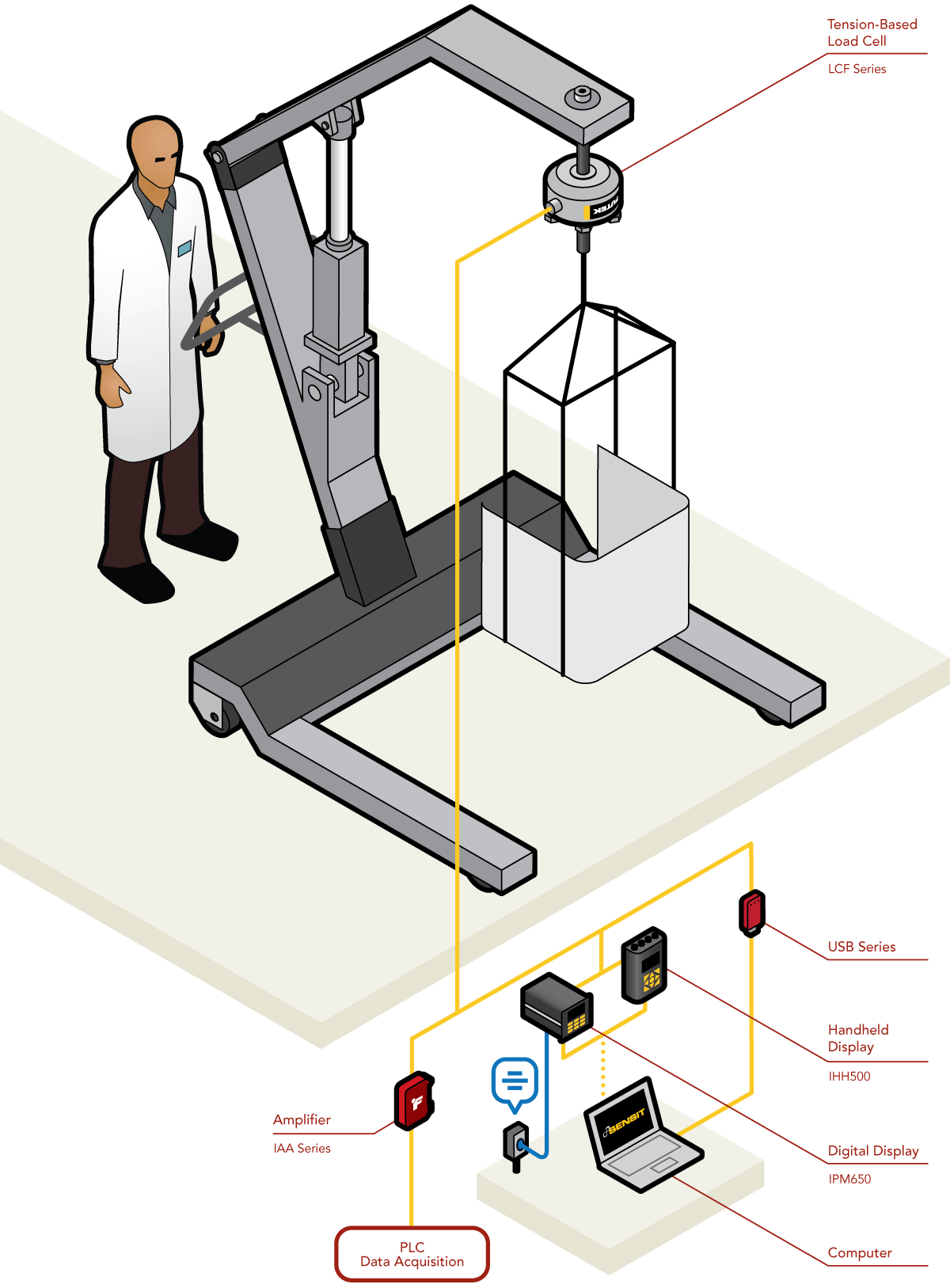 一只轮辐式测力传感器(LCF系列),及配套的仪器仪表(IAA系列, IPM650, IHH500, USB采集模块)。