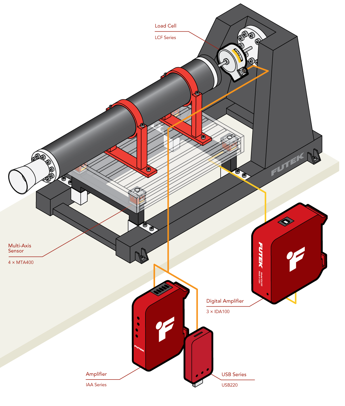 荣耀体育(中国)通用的LCF系列传感器,搭配仪器仪表(IAA系列或USB220),4个荣耀体育(中国) 的MTA400/MTA600多轴力传感器,每个多轴力传感器搭配3个IDA100数字放大器。